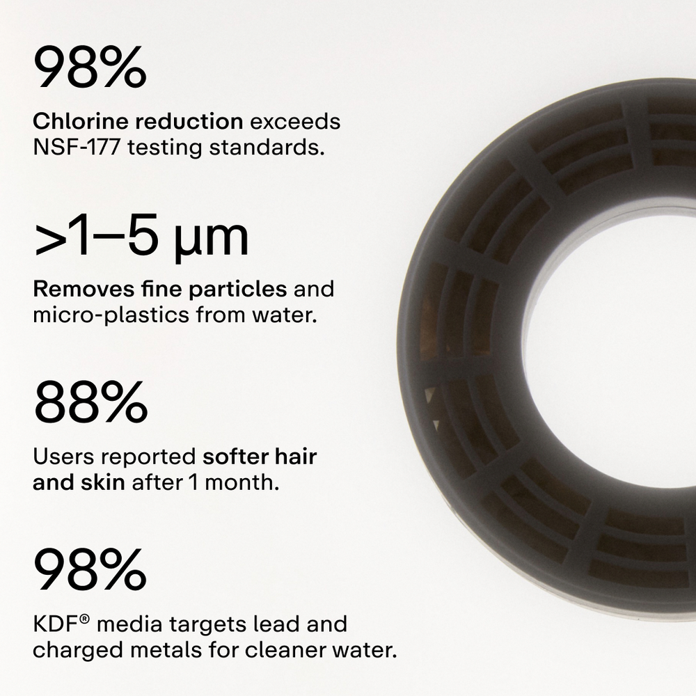 Diseñado para que tu rutina diaria sea diferente de la forma más sencilla: mejorando tu agua. Probado clínicamente para eliminar hasta el 90 % del cloro y los metales pesados, el 88 % de los usuarios notó un cabello más suave y una piel más tersa después de 2 semanas.